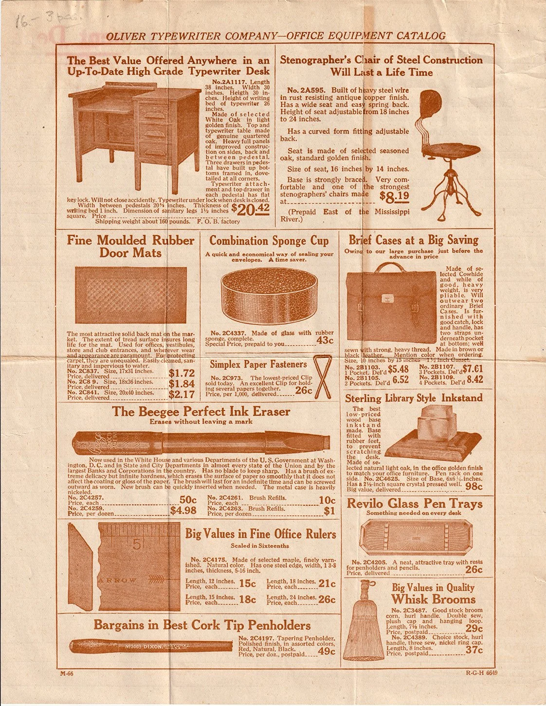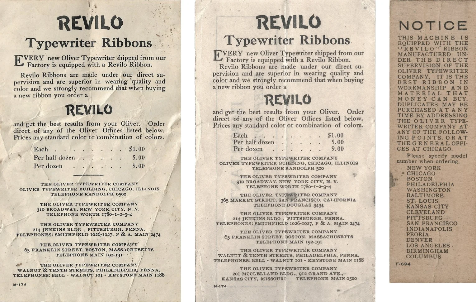 In addition to Oliver typewriters, I also collect Oliver-related items which are exhibited below. A general rule of thumb I follow is that the item must be specifically branded as Oliver or a related name variant. For example, typewriter desks manufactured by the Dearborn Company of Chicago were sold by The Oliver Typewriter Company, but not branded with the Oliver name. Therefore, these are not contenders for the collection.