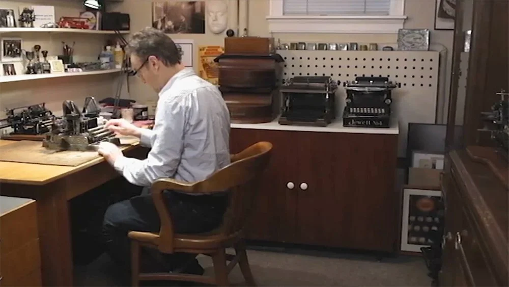 Typewriter collector Martin Howard types on his nickel-plated Oliver No. 2.