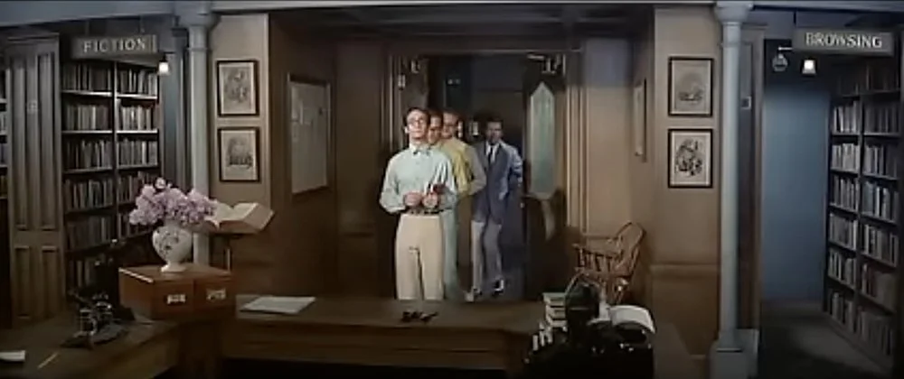 An Oliver No. 9 sits on the counter in the library. Shirley Jones imitates typing during one part of the musical number.