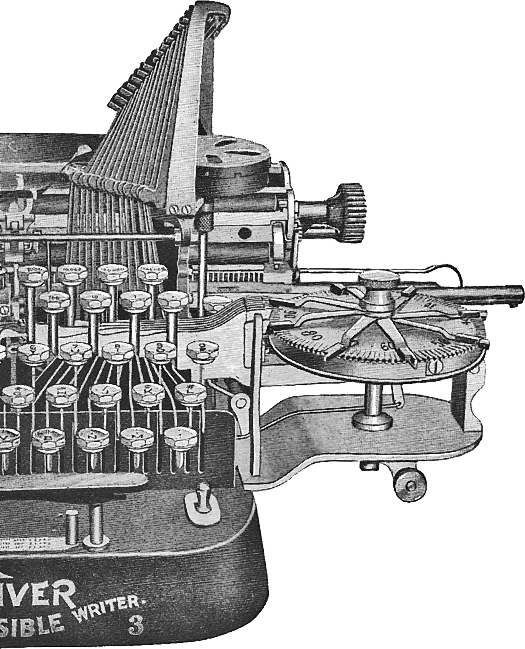 While all known specimens of the Oliver No. 1 have 28 character keys, the earliest version appears to have been a 26-key model. This claim is supported by the first Oliver No. 1 advertisement in the September 1893 issue of The Illustrated Phonographic World, as well as U.S. Patent No. 542,275. The advertisement, written by Reverend Thomas Oliver, notes that his invention is capable of printing 80 characters. This confirms 26 keys typing three characters each (lowercase, uppercase, and figures). Additionally, the accompanying illustration by Hilpert & Chandler Wood Engravers of Chicago depicts an Oliver No. 1 with 26 character keys. While the ampersand and period keys are absent, the most intriguing difference is the P key placed to the right of the M key on the bottom row instead of the top row. This key arrangement can also be seen in the illustrations of U.S. Patent No. 542,275, filed September 19, 1893. Other notable features of these early depictions include cylindrical rods connecting the key tops to the horizontal key levers, and an early spur-gear ribbon advancing mechanism.