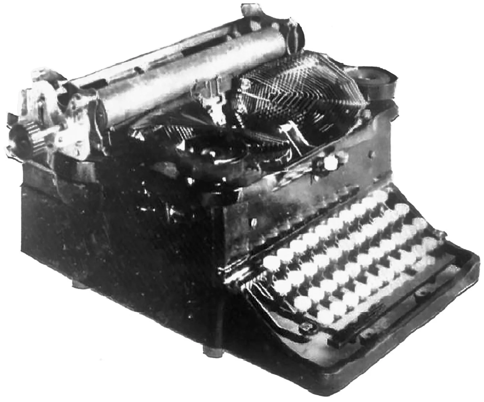 In 1922, Theron Lorenzo Knapp, chief design engineer of The Oliver Typewriter Company, presented to the board of directors his new four-bank typewriter design that resembled more conventional typewriters on the market at the time. Knapp’s machine retained the iconic U-shaped Oliver typebars, but mounted to strike the front of the platen as opposed to the top. Despite its novel design, this prototype never reached production, and was likely scrapped or absorbed into British Oliver, the company formed after the U.S. operation ceased.
